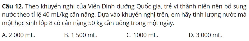 Lượng nước mà một học sinh lớp `8` có cân nặng `50` kg cần uống trong một ngày là: `40.50=2000` ml