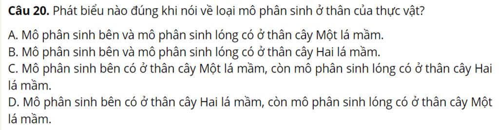 `-` Giải thích : Vì mô phân sinh bên có ở thân cây Hai lá mầm, còn mô phân sinh lóng có ở thân cây Một lá mầm.