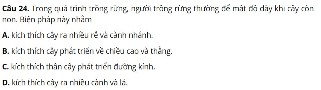 `-` Vì người trồng rừng thường để mật độ dày khi cây còn non. Biện pháp này nhằm kích thích cây phát triển về chiều cao và thẳng, giúp cho cây trồng phát triển được đầy đủ và trọn vẹn.