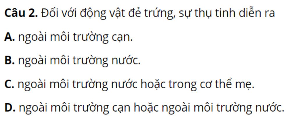 Câu 2. Đối với động vật đẻ trứng, sự thụ tinh diễn ra :