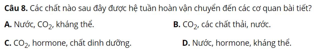 Câu 8. Các chất nào sau đây được hệ tuần hoàn vận chuyển đến các cơ quan bài tiết?