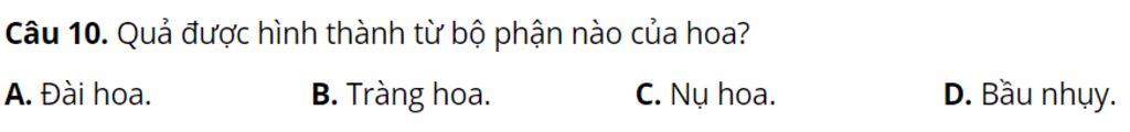 Câu `10`. Quả được hình thành từ bộ phận nào của hoa?