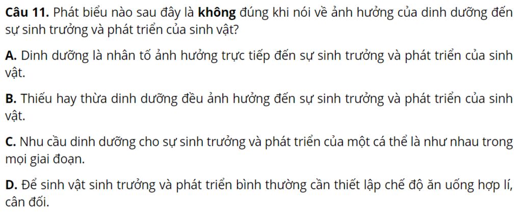 `@`Nhu cầu dinh dưỡng cho sự sinh trưởng và phát triển của một cá thể là như nhau trong mọi giai đoạn sai vì nhu cầu dinh dưỡng của một cá thể có thể thay đổi theo các giai đoạn khác nhau của cuộc đời