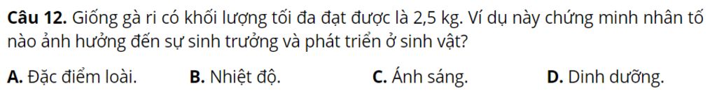Giống gà ri có khối lượng tối đa đạt được là 2,5 kg. Ví dụ này chứng minh nhân tố nào ảnh hưởng đến sự sinh trưởng và phát triển ở sinh vật?