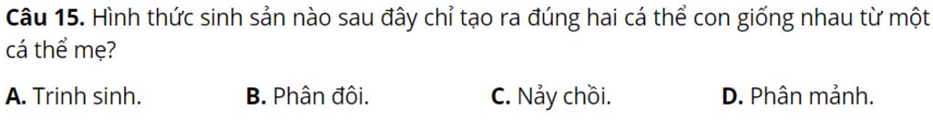 Câu `15`. Hình thức sinh sản nào sau đây chỉ tạo ra đúng hai cá thể con giống nhau từ một cá thể mẹ?