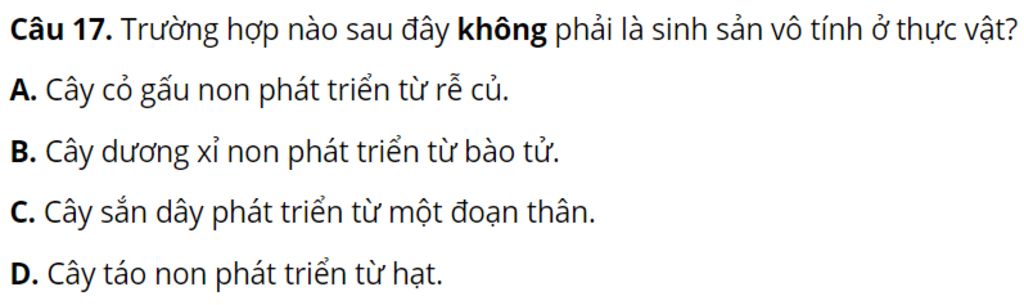 Câu `17:` Trường hợp nào sau đây không phải là sinh sản vô tính ở thực vật `?`