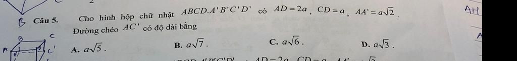 = \sqrt {{{\left( {a\sqrt 2 } \right)}^2} + {{\left( {a\sqrt 5 } \right)}^2}} = a\sqrt 7 \to B
