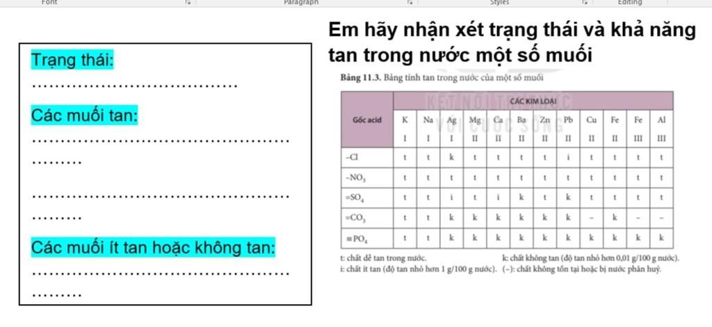 Các muối tan: Muối của kim loại $K$, $Na$ đều tan, muối chứa gốc $Cl(I)$ hầu hết đều tan (trừ $AgCl$ không tan, $PbCl_2$ ít tan), muối chứa gốc $NO_3(I)$ đều tan.