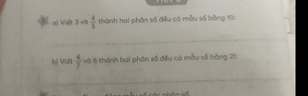 Vậy `4/7` và 6 viết thành hai phân số đều có mẫu số bằng 21 là: `12/21` và `126/21`