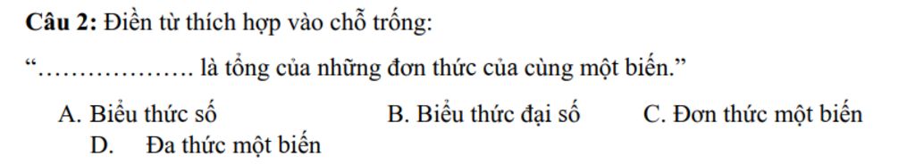 Câu 2: Điền từ thích hợp vào chỗ trống: ......................... là tổng của những đơn thức của cùng một biến.”