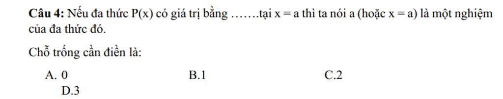 `@` Khái niệm nghiệm của đa thức: Nếu đa thức P(x) có giá trị bằng`0` tại x=a thì ta nói a (hoặc x=a) là một nghiệm của đa thức đó.