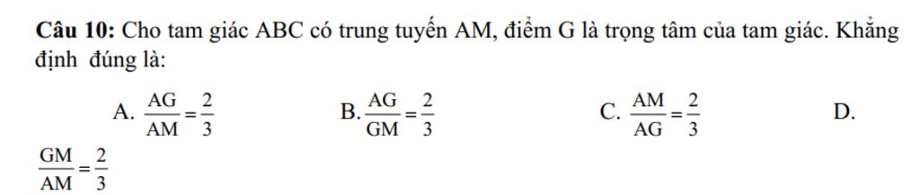 `@` `triangleABC` có trung tuyến `AM` và trọng tâm `G`