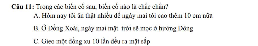 B.Ở Đồng Xoài, ngày mai mặt trời sẽ mọc ở hướng Đông là biến cố chắc chắn vì mặt trời lúc nào cũng mọc ở đằng đông
