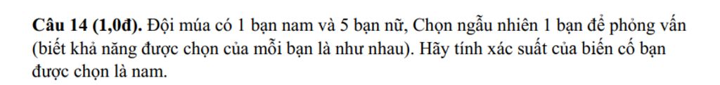 `->` vậy xác suất biến cố được chọn được bạn nam là `1/6`