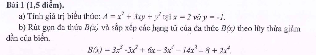 Bài 1 (1,5 điểm). a) Tính giá trị biểu thức: $A = x^2 + 3xy + y^2$ tại x = 2 và y = -1