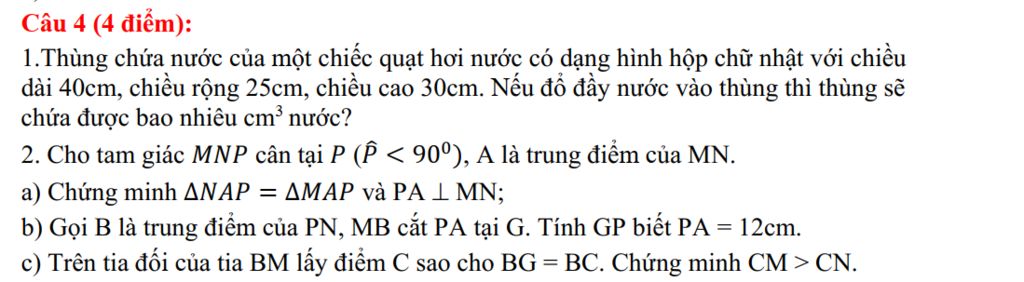 1.Thùng chứa nước của một chiếc quạt hơi nước có dạng hình hộp chữ nhật với chiều dài 40cm, chiều rộng 25cm, chiều cao 30cm. Nếu đổ đầy nước vào thùng thì thùng sẽ chứa được bao nhiêu cm nước?