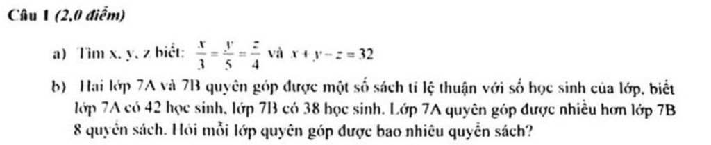 `b)` Gọi số sách hai lớp `7A,7B` quyên góp được lần lượt là `x,y(`quyển sách,`x,y inNN`*`)`