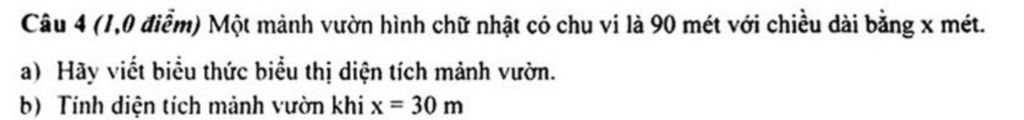 `b)` Thay `x=30,` ta được `:30(45-30)=30.15=450m^2`