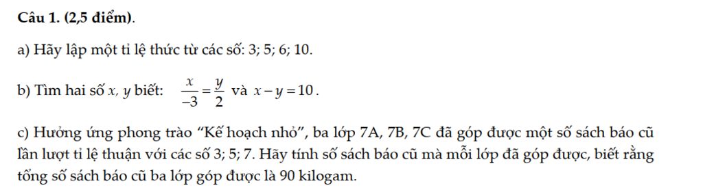 Theo đề bài, ta có: Số sách báo cũ mà ba lớp 7A, 7B, 7C đã góp được tỉ lệ thuận bới 3;5;7, với tổng số sách báo cũ ba lớp góp được là 90kg