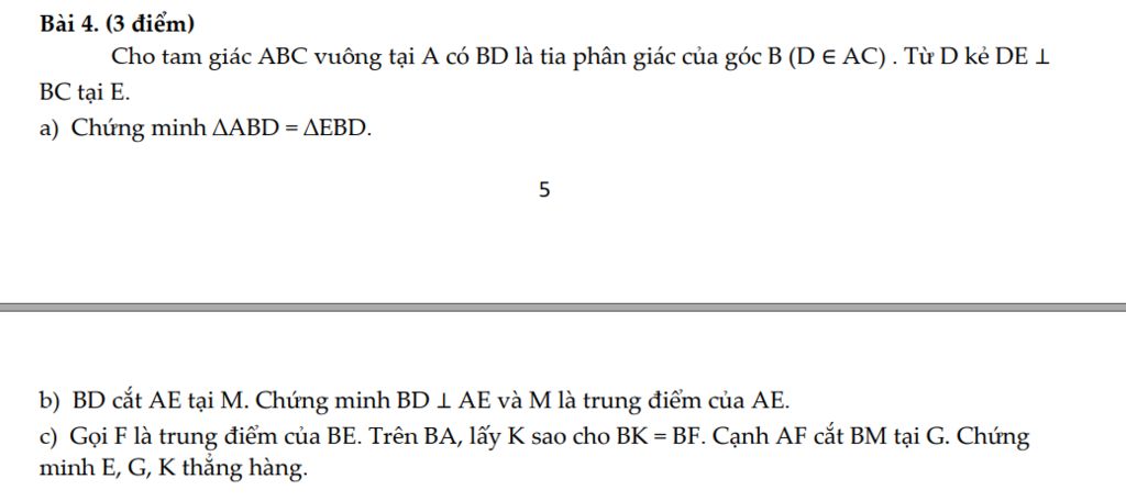 c) Gọi F là trung điểm của BE. Trên BA, lấy K sao cho BK = BF. Cạnh AF cắt BM tại G. Chứng minh E, G, K thẳng hàng.