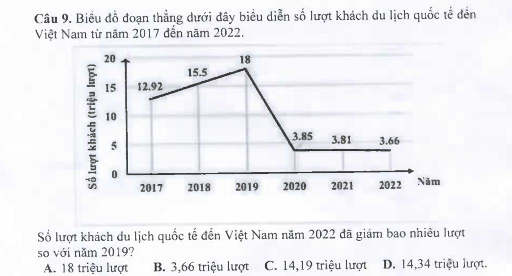 `18 - 3,66 = 14,34` (triệu lượt khách du lịch so với năm `2019.`)