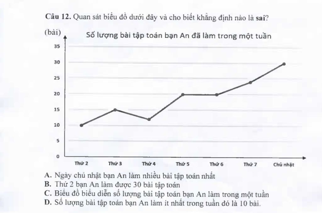 `B.` Sai vì thứ `2` bạn An làm được `10` bài tập toán.