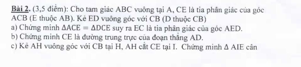 Bài 2. (3,5 điểm): Cho tam giác ABC vuông tại A, CE là tia phân giác của góc ACB (E thuộc AB). Kẻ ED vuông góc với CB (D thuộc CB)