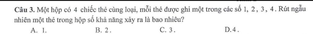 Câu 3. Một hộp có 4 chiếc thẻ cùng loại, mỗi thẻ được ghi một trong các số 1, 2, 3, 4. Rút ngẫu nhiên một thẻ trong hộp số khả năng xảy ra là bao nhiêu?