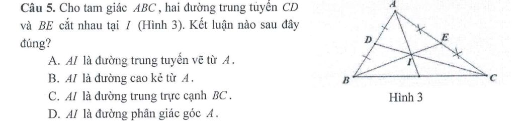 Cho tam giác ABC, hai đường trung tuyến CD và BE cắt nhau tại I (Hình 3). Kết luận nào sau đây đúng?