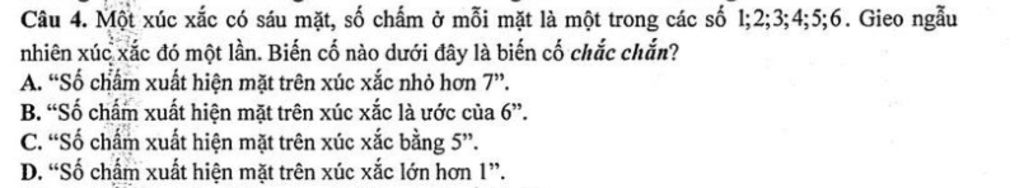 `D.` Là biến cố ngẫu nhiên vì có thể ra mặt `1` chấm.