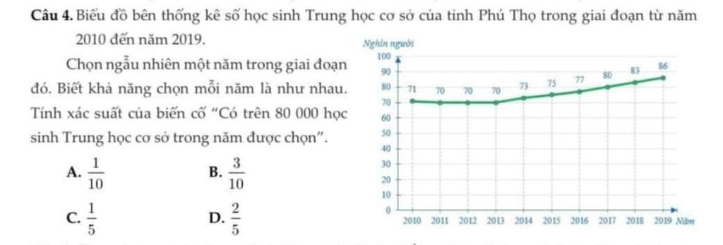 `=>` Xác suất của biến cố “Có trên 80 000 học sinh Trung học cơ sở trong năm được chọn” là `2/10=1/5`