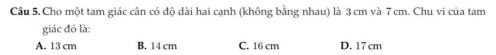 Tam giác cân có `2` cạnh là `3 cm` và `7 cm` thì cạnh còn lại phải bằng `7 cm`.