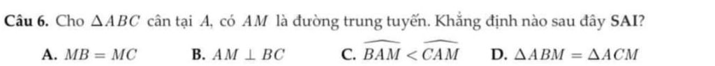 `@` Trong `1` tam giác cân thì các các trung tuyến đồng thời là đường phân giác, đường cao, đường trung trực. Và nó chia thành `2` tam giác bằng nhau.