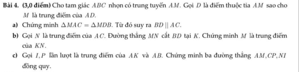 Bài 4. (3,0 điểm) Cho tam giác ABC nhọn có trung tuyến AM. Gọi D là điểm thuộc tia AM sao cho M là trung điểm của AD.