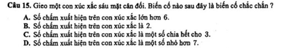 `-` Vì xác suất của biến cố `:` Số chấm xuất hiện trên con xúc xắc là số chia hết cho `3` là `2/6 =1/3` nên là biến cố ngẫu nhiên nên loại `C.`
