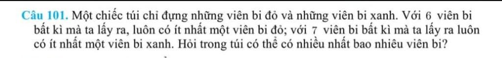 Câu 101. Một chiếc túi chỉ đựng những viên bị đỏ và những viên bị xanh. Với 6 viên bị