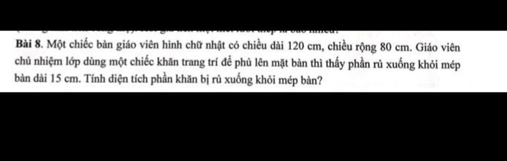 Bài 8. Một chiếc bàn giáo viên hình chữ nhật có chiều dài 120 cm, chiều rộng 80 cm. Giáo viên chủ nhiệm lớp dùng một chiếc khăn trang trí để phủ lên mặt bàn thì thấy phần rủ xuống khỏi mép bàn dài 15 cm. Tính diện tích phần khăn bị rủ xuống khỏi mép bàn?