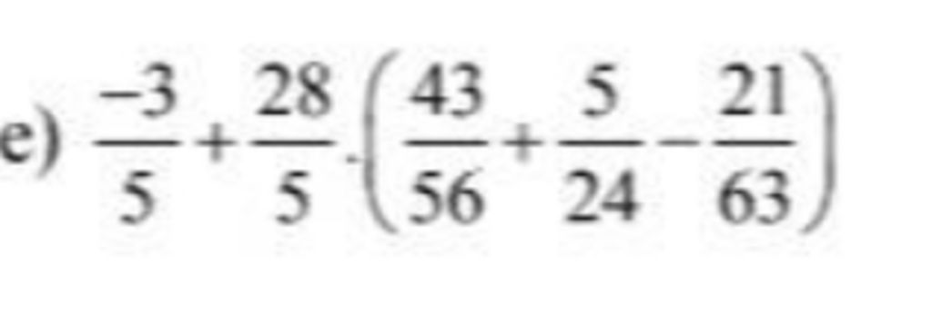 $\frac{-3}{5}$ +$\frac{28}{5}$+($\frac{43}{56}$+$\frac{5}{24}$-$\frac{21}{63}$)