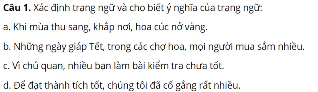 Câu 1. Xác định trạng ngữ và cho biết ý nghĩa của trạng ngữ:
