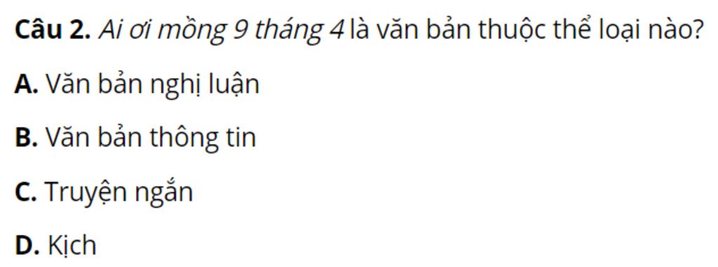 Câu 2. Ai ơi mồng 9 tháng 4 là văn bản thuộc thể loại nào?