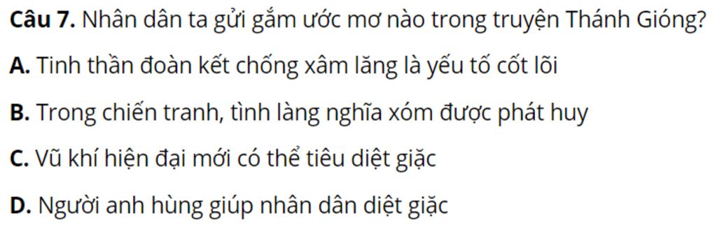 Câu 7. Nhân dân ta gửi gắm ước mơ nào trong truyện Thánh Gióng?