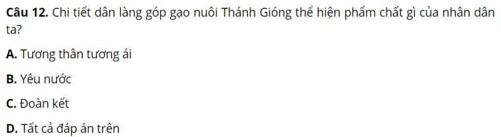 Câu 12. Chi tiết dân làng góp gạo nuôi Thánh Gióng thể hiện phẩm chất gì của nhân dân ta?