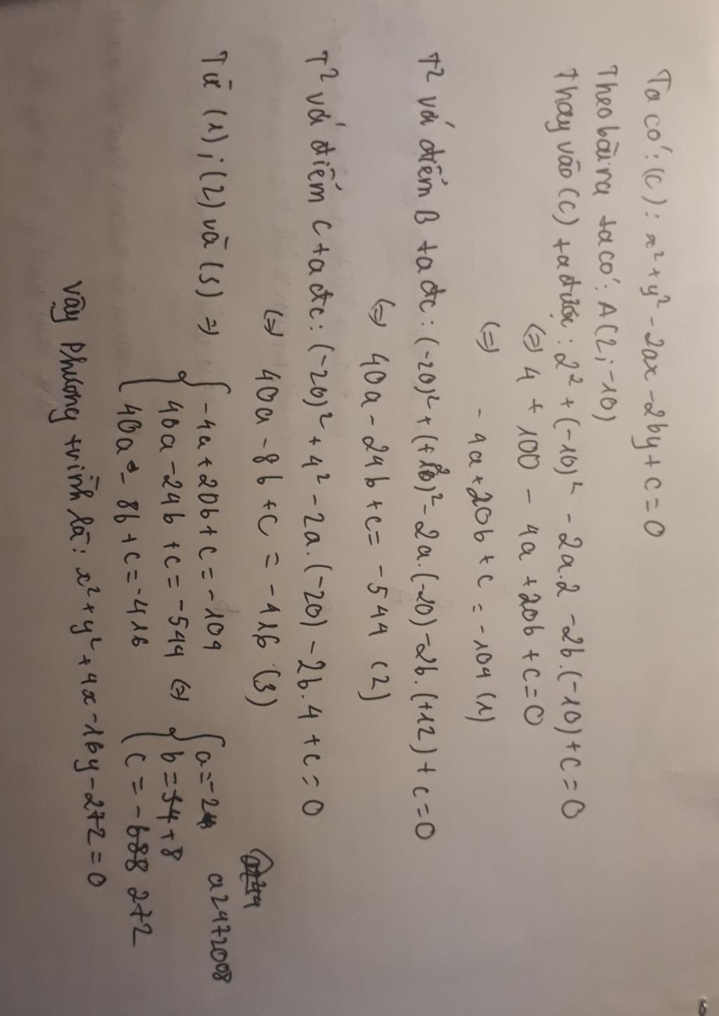 Vì `(C)` ngoại tiếp tam giác `ABC` nên ta thay lần lượt các điểm `A, B, C` vào `(C)` ta được hệ phương trình: