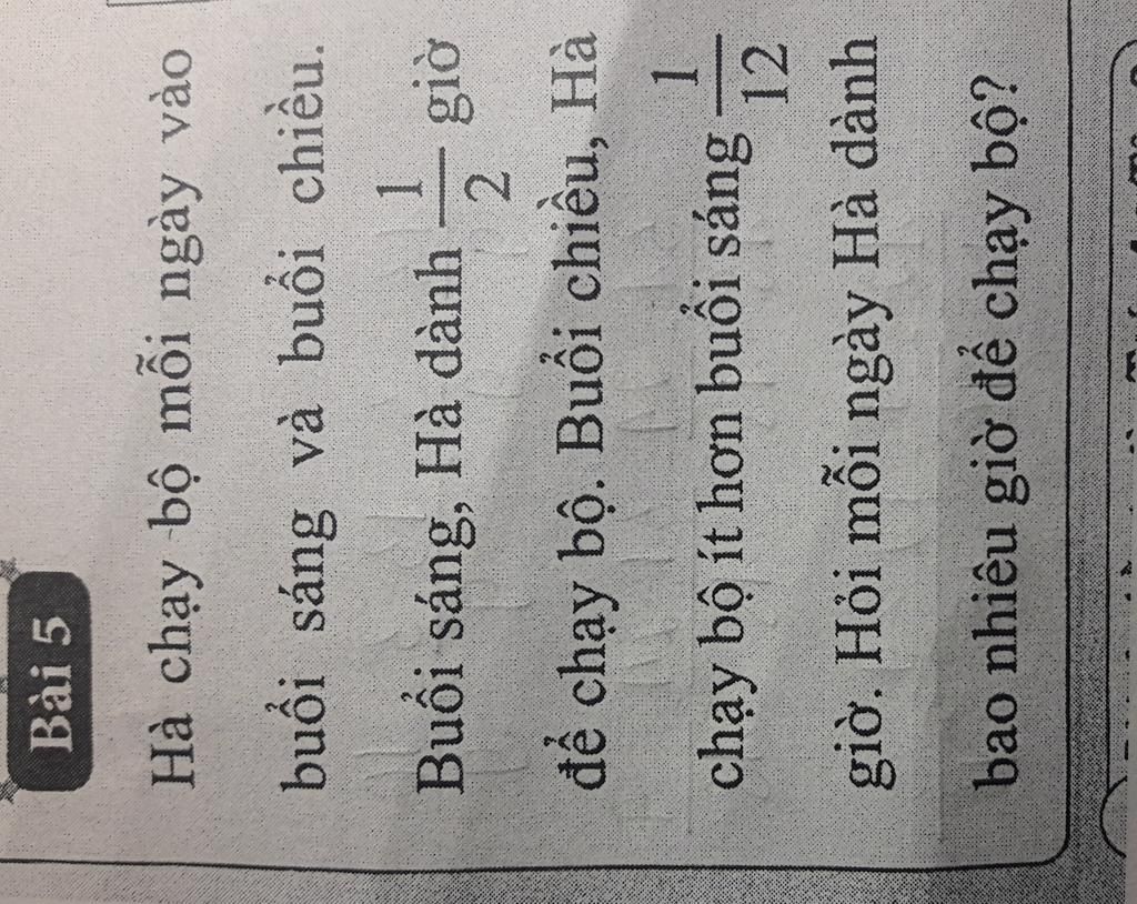Bài 5: Hà chạy bộ mỗi ngày vào buổi sáng và buổi chiều.Buổi sáng,Hà dành 1/2 giờ để chạy bộ.Buổi chiều,Hà chạy bộ ít hơn buổi sáng 1/12 giờ.Hỏi mỗi ngày Hà dành bao nhiêu giờ để chạy bộ ?