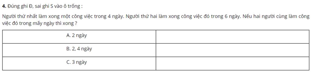 `4.` `1` ngày, người thứ nhất làm được số phần của công việc là: