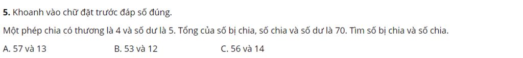 5. Khoanh vào chữ đặt trước đáp số đúng. Một phép chia có thương là 4 và số dư là 5. Tổng của số bị chia, số chia và số dư là 70. Tìm số bị chia và số chia.