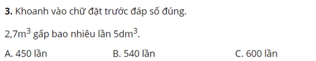 `2,7m^3` gấp `5dm^3` số lần là `:`