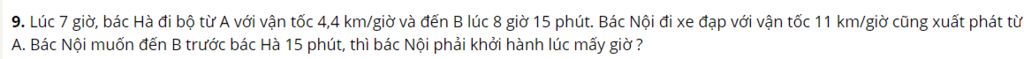 Bác Nội muốn đến `B` trước bác Hà thì phải khởi hành từ lúc: