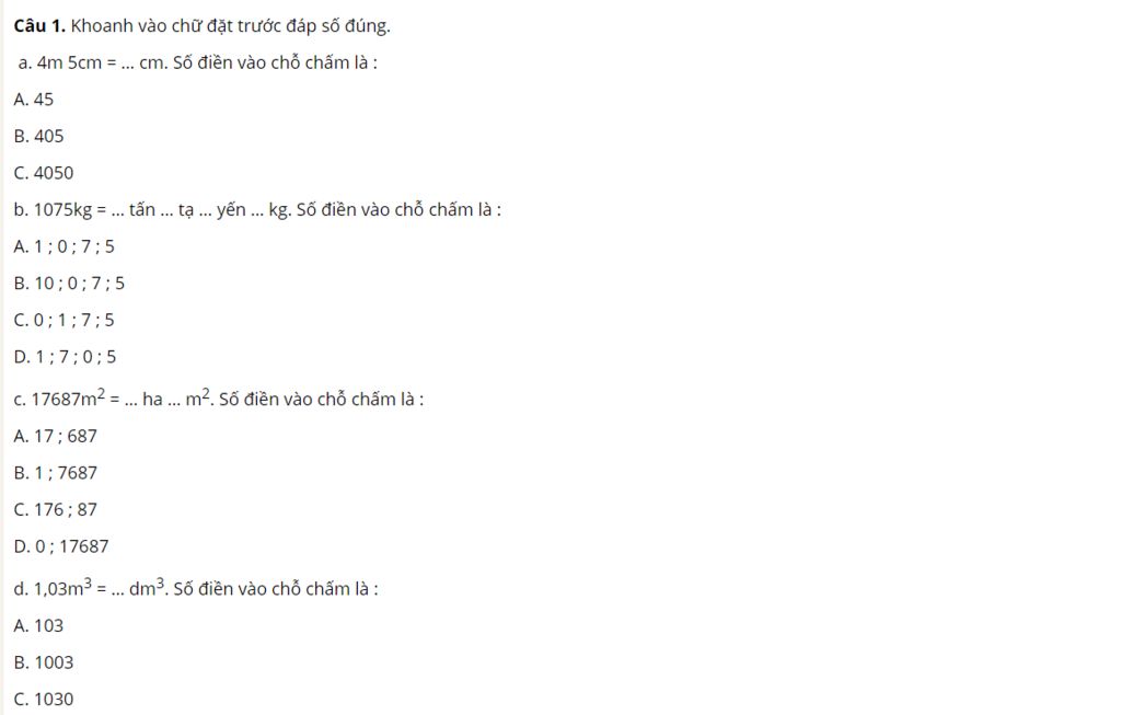 `=>` `1075` `kg` `=` `1` tấn `0` tạ `7` yến `5` `kg`