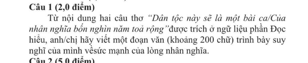 Có phải chỉ khi chiến tranh xảy ra thì con người ta mới nghĩ tới hoà bình?Có phải khi quá khứ lặp lại thì ta mới mơ ước tới tương lai?.Thế nhưng,có một thứ ta không thể nào quên,đã là con người Việt Nam thì sẽ luôn nhớ tới sự đoàn kết,sự keo sơn của dân tộc.Bởi "Dân Tộc này sẽ là một bài ca/của nhân nghĩa bốn nghìn năm toả rộng".Vâng ánh sáng chiếu rọi vào tim ta chính là lòng nhân nghĩa mà suốt bốn nghìn năm cha ông đã lan toả và sẻ chia.Lòng nhân nghĩa ta có thể hiểu đó là lòng yêu thương giữa ng vs ng,là những thái độ đúng đắn,phù hợp với đạo lí của dân tộc Việt Nam ta.Từ thuở xưa, lòng nhân nghĩa chính là sợi dây vô hình nối dài tình cảm và tạo nên sức mạnh to lớn.Chính nhờ có lòng nhân nghĩa mà nhân dân ta đã đánh đuổi biết bao giặc dữ,bt bao trận đánh làm vang động lịch sử.Lòng nhân nghĩa làm con ng rèn rũa thêm đức tính và giúp tạo nên sức mạnh,tạo nên những điều tưởng chừng như k thể thực hiện.Có mấy ai nghĩ,trc một đất nc Việt nhỏ bé, với những vũ khí thô sơ và điều kiện kinh tế hạn hẹp lại có thể phá tan trận địa của các đế quốc hùng mạnh.Có mấy ai nghĩ ta lại có thể đánh bại quân nguyên mông-nc mà đc xem là có lực lượng hùng hậu nhất bấy giờ,đâu ai nghĩ ta lại có thể đánh đuổi đc bọn thưcj dân pháp vs trận đánh lừng lẫy năm châu,chấn động địa cầu và còn rất nhiều,rất nhiều nx.Không ai nghĩ ta có thể tạo nên đc kì tích như phép màu ấy,nhưng tất cả ắt hẳn lòng nhân nghĩa chính là thứ mà góp phần to lớn nhất trong chiến thắng,nó giúp ta biết yêu thương,đoàn kết,bt sẻ chia,chung sức chung lòng và đó còn làm nền móng cho sức mạng tập thể,tạo nên nguồn năng lượng to lớn.Loài ong muốn đắp mật đầy tổ thì phải là cả một quá trình mà tập thể cùng đi hút nhụy,tìm hoa.Và con ng cũng thế,nếu không có lòng nhân nghĩa mà chỉ sống ích kỷ,đơn độc thì trái tim sẽ hoá đá và tan biến vào hư không,không thể làm nên những điều vượt trội,không thể ghi tên dấu ấn lên trên khoảng không cuộc sống.Người có lòng nhân nghĩa sẽ đc mọi ng đáp lại vs những tình yêu thương,như một quy luật tất yếu về cách đối nhân xử thế.Hơn nx,khi cta bt yêu thương,giúp đỡ,sẻ chia và lan rộng tấm lòng của mình thì xã hội sẽ ngày một văn minh,tiến bộ và phát triển hơn.Lòng nhân nghĩa chính là một đức tính quý báu,một văn hoá cần đc giữ gìn và mở rộng.Cuộc sống sẽ đẹp hơn,ý nghĩa gấp bội lần khi lòng nhân nghĩa đc lan toả trong trái tim mọi ng.Hãy lên án và phê phán những ng có trái tim lạnh,sống cá nhân,thu mình vào ốc đảo độc lập và bản thân cần phải duy trì và phát huy đức tính tốt đẹp để cuộc đời thêm nhiều màu sắc,ý nghĩa hơn.....